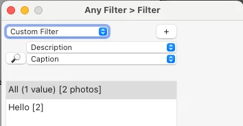 10. Run the Any Filter plugin's Filter command and observe that it displays "Hello" as the caption for both photos, demonstrating the the catalog has correctly recorded the new caption: