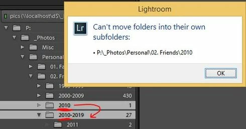 I have a folder named, "2010". I created another folder in the same level as "2010-2019". Attempting to move "2010" into the new "2010-2019" folder results in the below error. Rename to "a2010-2019", then moving 2010 into the new "a2010-2019" folder works. After that, I renamed "a2010-2019" back to "2010-2019"