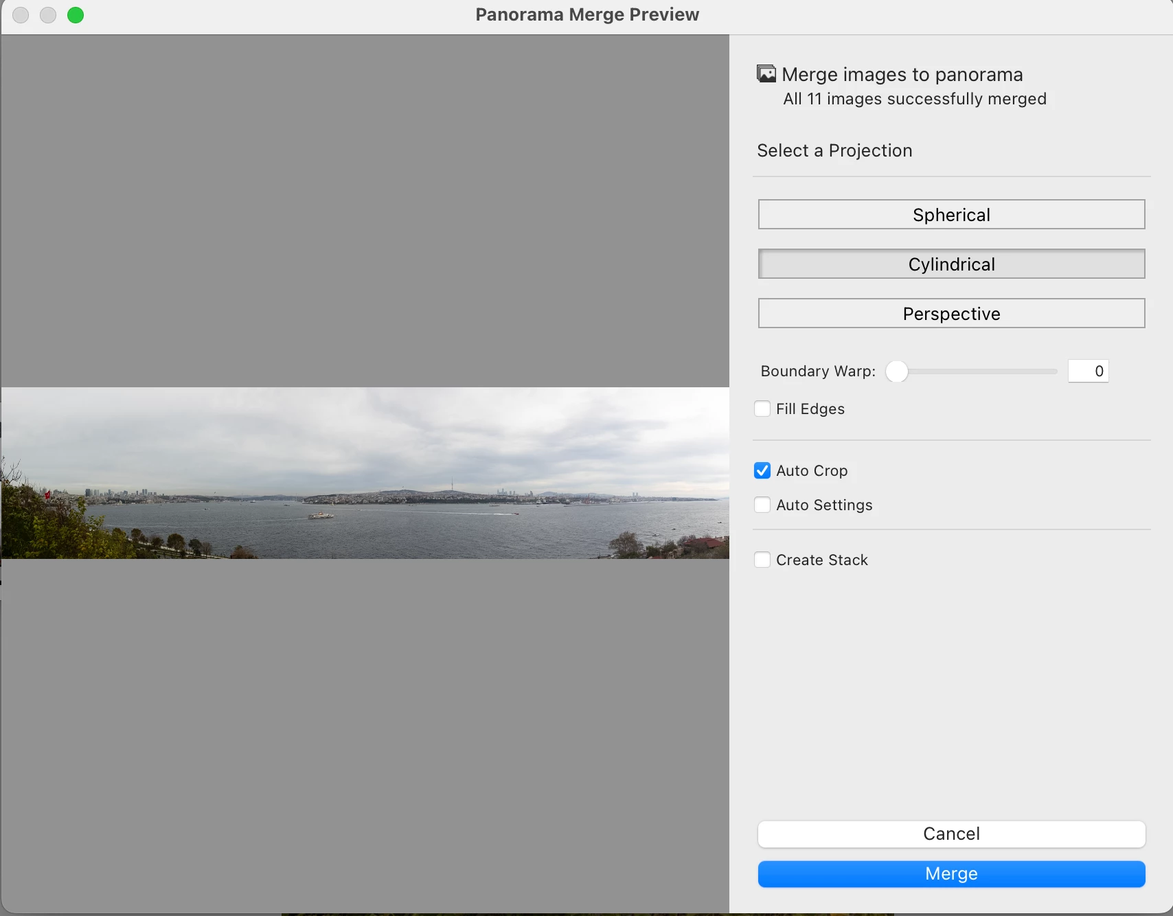 - Select cylinder projection merge, auto crop, and merge