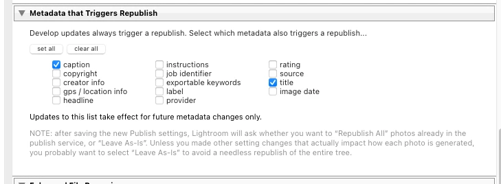 I see other posts in the forum here on related topics, such as complaints that publish services are forcing a re-publish of unchanged photos. I'm posting this because I think I've diagnosed this to a deeper level than most users.