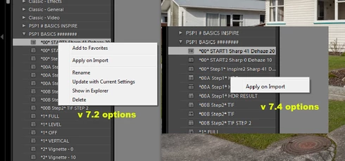 After upgrading from 7.2 to 7.4, all of a sudden the option to update any pre existing personalised presets with 'Update with Current Settings' has been removed and replaced with only 'Apply on Import'. I'd like to know why and if this is a bug can it be repaired please as I use this function on every Lightroom session. Thanks,