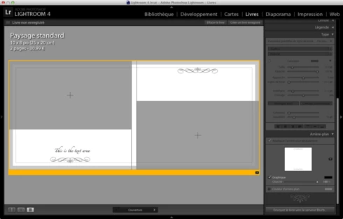 I apply a graphic background (the first choice of graphical backgroup in wedding tab) on my standard landscape and the back cover has a text area on the center of the page. I centered my text on my page.