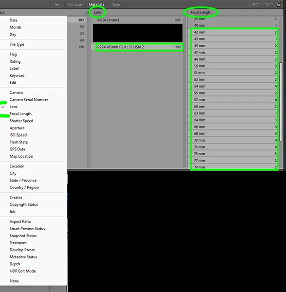 - select the images with Lens and Focal Length filter