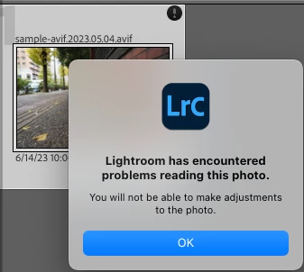 LR corrupts an .avif image when it tries to write the file's metadata. To reproduce: