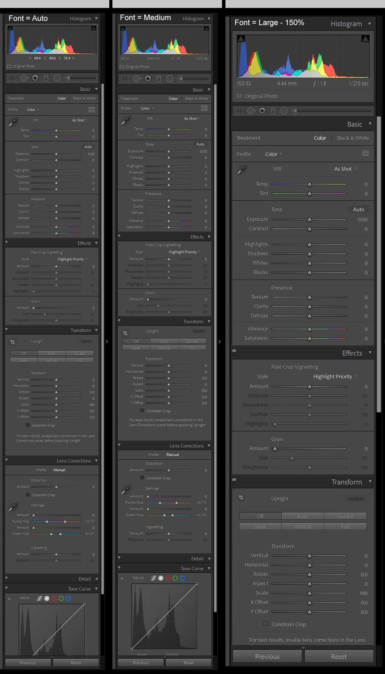 I’m having issues with Lightroom however. Whatever I do, the interface size is either too large or small. In the screenshots below you can see Preferences, Interface, Font Size set to Auto, Medium and Large – 150%.