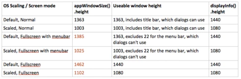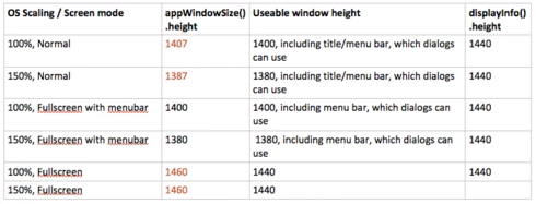 The following tables show the heights returned by appWindowSize() for the combinations of operating system, the operating-system display scaling, and LR's Screen Mode. "Useable window height" is the height of that part of the app window that SDK dialogs can occupy. Erroneous return values are in red.