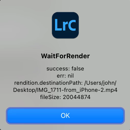 This shows that the video has been successfully exported to the desktop, but rendition:waitForRender() incorrectly returns "false, nil". It should have returned: