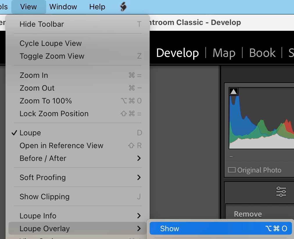 * On Mac in Develop, Cmd Alt O invokes View > Loupe Overlay > Show, regardless of whether the Remove panel is open.