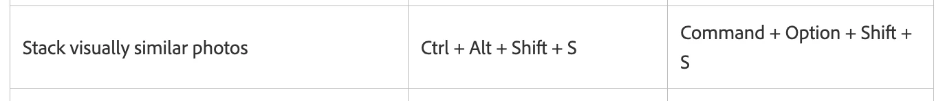 The Lightroom Classic Keyboard Shortcuts help shows a shortcut for the non-existent command Stack Visually Similar Photos: