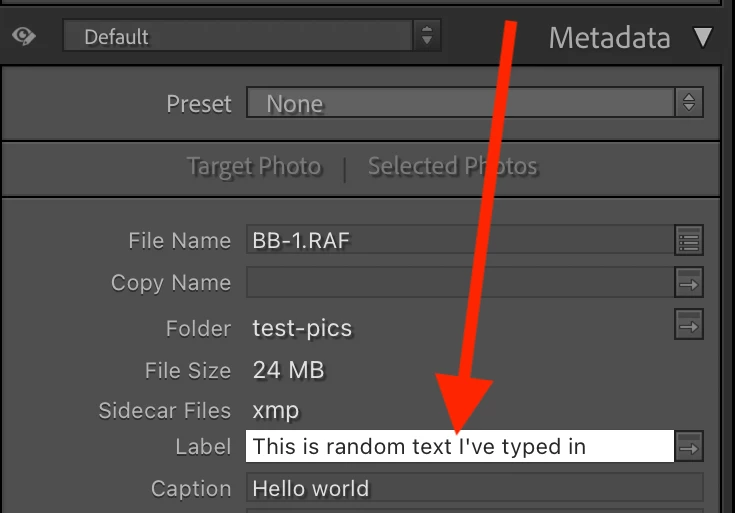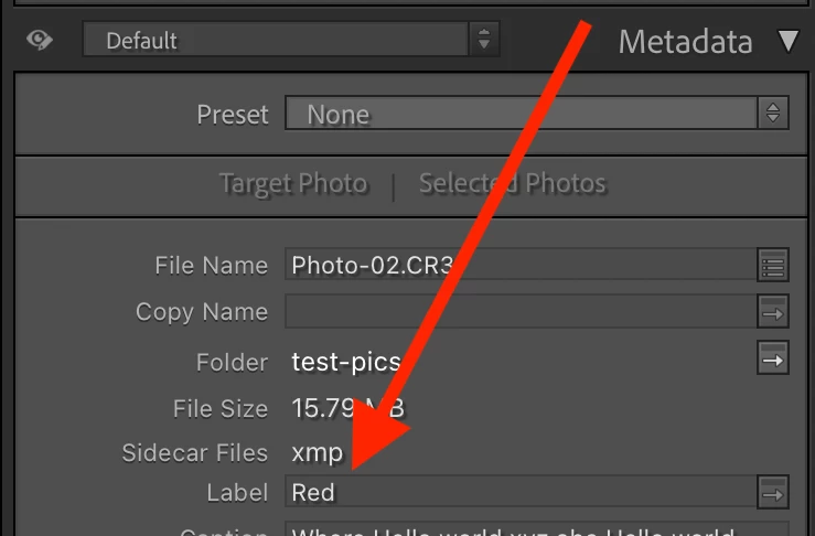 2. Set Metadata Color Label Set to "Lightroom Default" and add a RED label to Photo-02