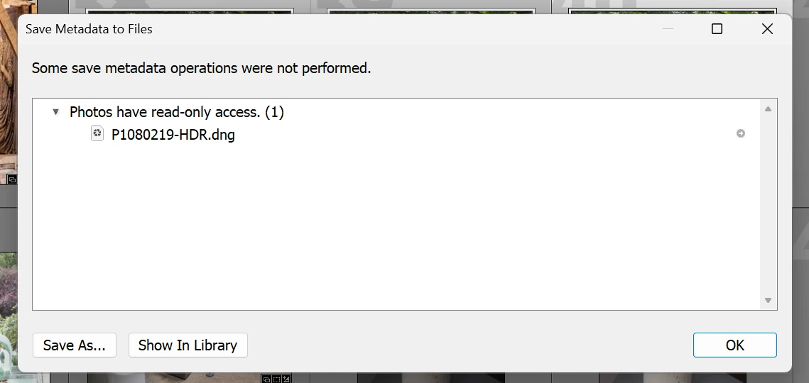 This is a recent, intermittent issue (I've used LR for years, and only seen this recently).  I'm running Lightroom Classic CC release 7.5.  When merging photos to HDR, Lightroom will process the images and at the moment it creates the DNG it sometimes outputs an error "Some save metadata operations were not performed".  It then states "Photos have read only access (1)", and lists the new dng file that was just created.  This also happens occasionally when merging to Panorama.