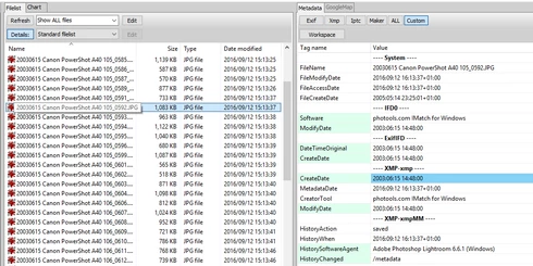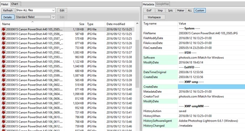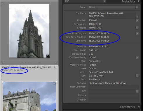 I fixed the first mentioned files before doing screenshots, so for comparison, here is the Metadata as shown in Lightroom for two other files.  The first has been given an erroneous Capture Date/Time; the second is correct.