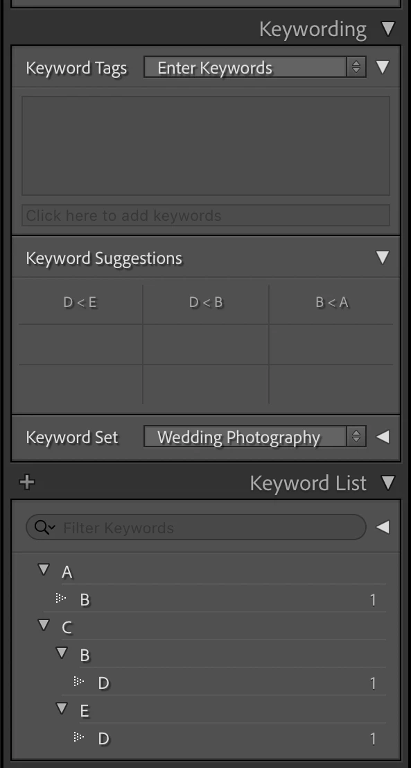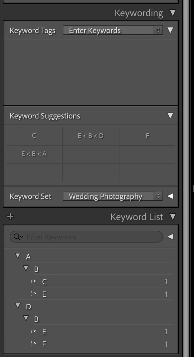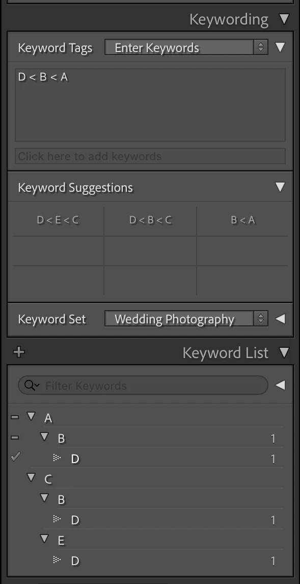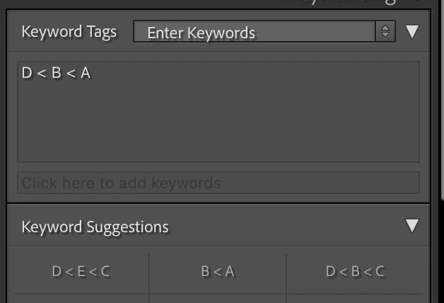 The expected result when clicking this suggestion is that it adds the "E < B < D" keyword to the photo. However, when you click the "E < B" suggestion, it creates a new E < B < A tag (which is A > B > E).