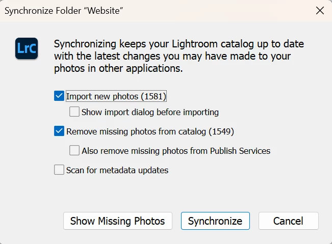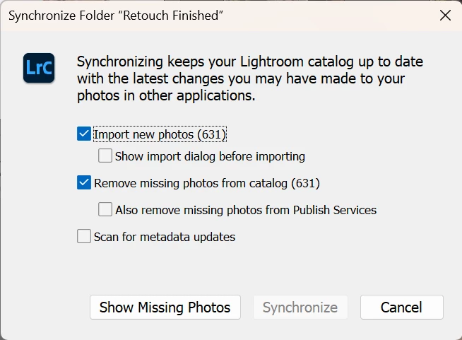 7. Right-click "pics" and do Synchronize Folder again, this time checking Show Import Dialog Before Importing, unchecking Remove Missing Photos From Catalog, and clicking Synchronize.