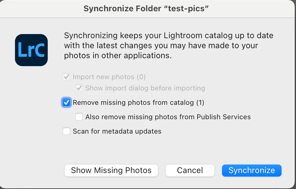 2. In the Folders panel, right-click the folder "test-pics" and do Synchronize Folder. Observe that it reports 1 missing photo: