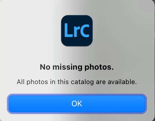 4. Do the command Library > Find All Missing Photos and observe that it reports no missing photos: