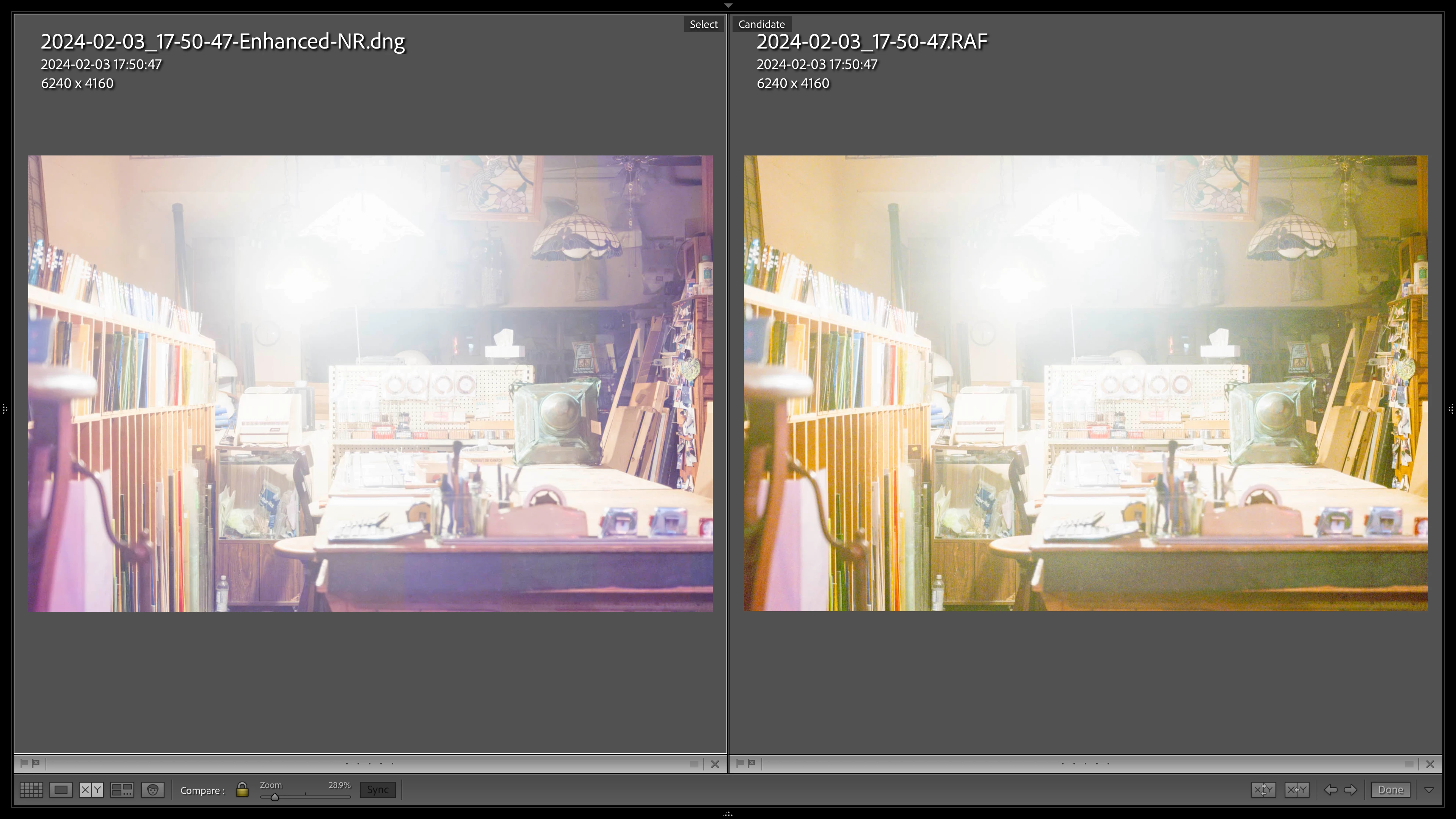 To ensure this wasn't caused by some aspect of the lights in the scene (doubtful), I Denoised and pushed a photo from months ago of a different location. Further, to ensure this wasn't some aspect of my camera or artificial lights, I repeated the process on a photo from last year taken with a different Fujifilm (X-T2 vs X-H2s) camera. The results are identical—bluish-reddish vertical banding in the deep shadows (not checkerboard like in your results).