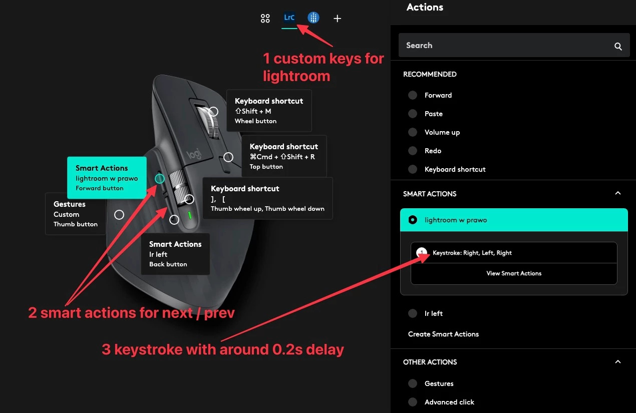 For Logitech Mouse Users: If you have a Logitech mouse with smart actions, here's a workaround I've been using. You can set up a keystroke for any custom button. Personally, I use the "next" button on my mouse to trigger a sequence of smart actions. Here’s how I do it: