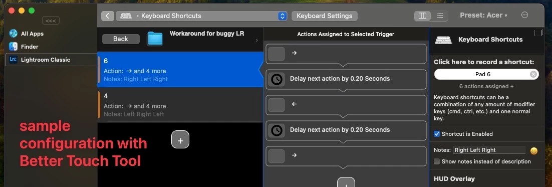 2. Set up the keystroke to mimic the following sequence: Right key, Left key, Right key, with a 0.2s delay between each press.