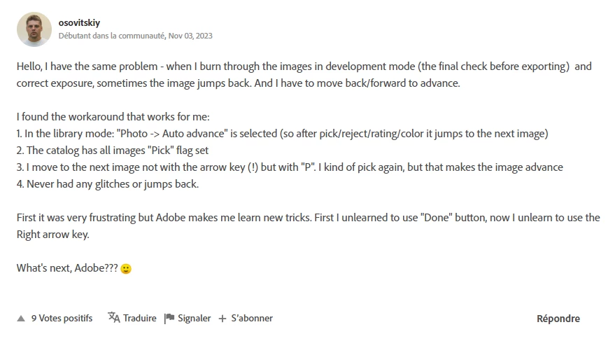 Why no one writes about the fact that in develop mode, after any manipulation with a photo, it is impossible to go to the next photo in the feed? You go, but the photo remains the same as it was, you have to go back and only then go to the next photo. This is a global problem!!  Anyway, I did some research and I realized why many people are silent about it, because this problem occurs only when using the +\- buttons on any keyboard, even on macbook !!!!. If you use only mouse or touchpad, there is no problem with photo transition. That's why many photographers don't pay attention to it, because they don't use the keyboard. Therefore, ADOBE does not react in any way.
