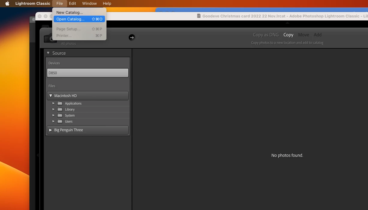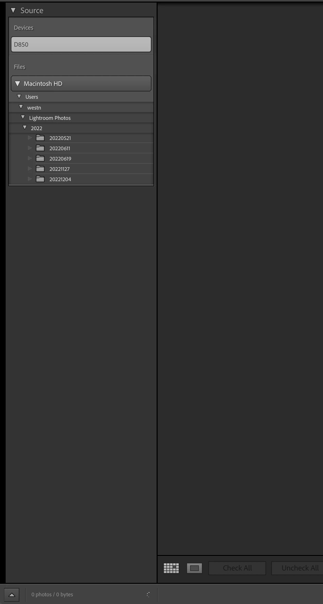 My Nikon D850 is directly connected to my Mac studio with a USB cable.  When I attempt to import photos with the latest version of Lightroom Classic, the import window shows the camera, but a small spinning circle in the bottom left corner spins forever, but never shows any images to import.  Import initially worked on this machine, it stopped working at some point, and when I reinstalled the OS and Lightroom, it briefly started working again.  I can import images using Apple's image capture software without any problems.  I also have no problems importing into the latest version of Lightroom Classic with the same camera on a different machine that is still running in Montery.  It's like there is a bug in the import software and something is crashing in the background.