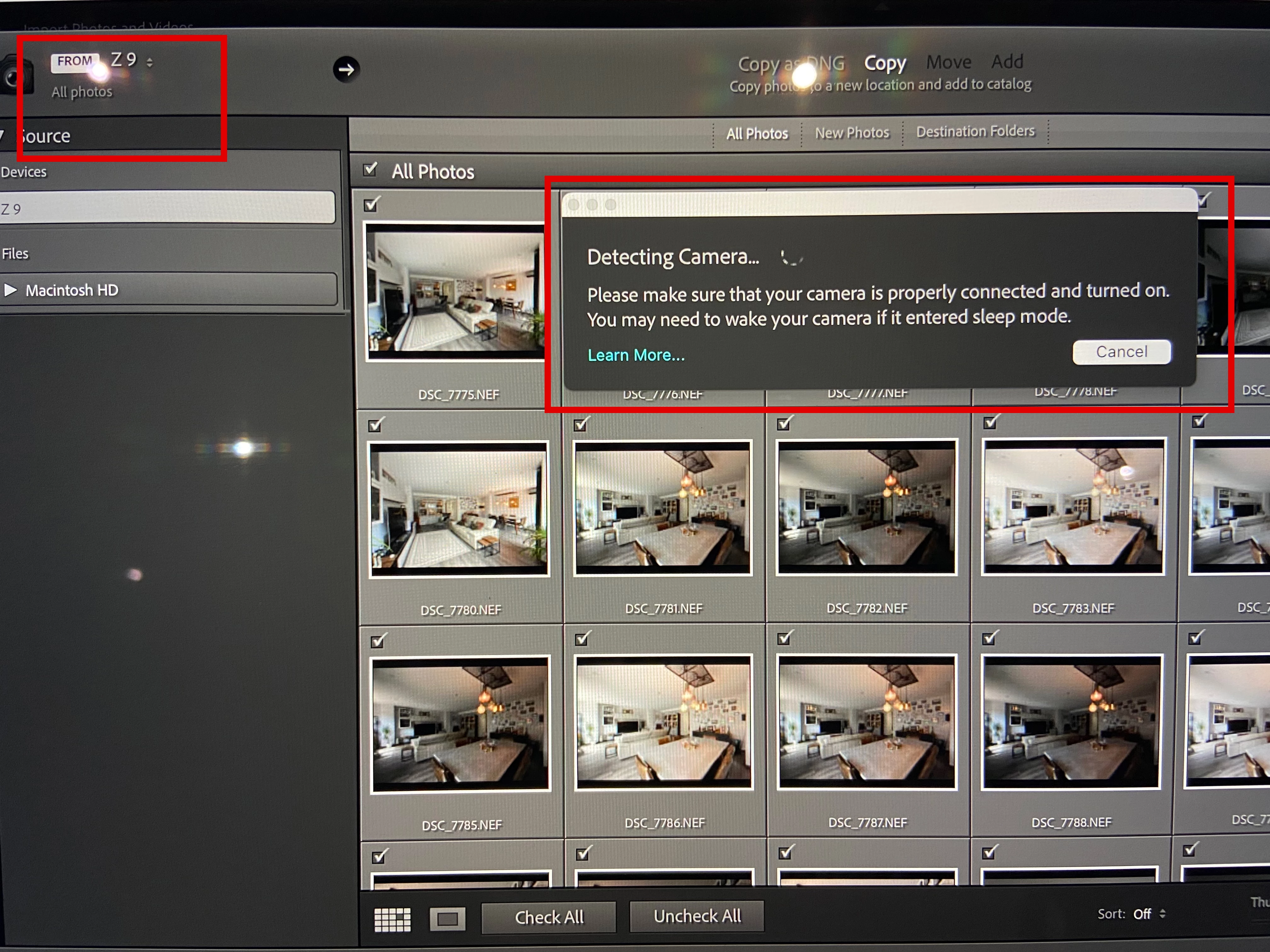 The Z9 is found on the computers, even Lightroom can see it (as per attached image) but cannot connect to the camera...