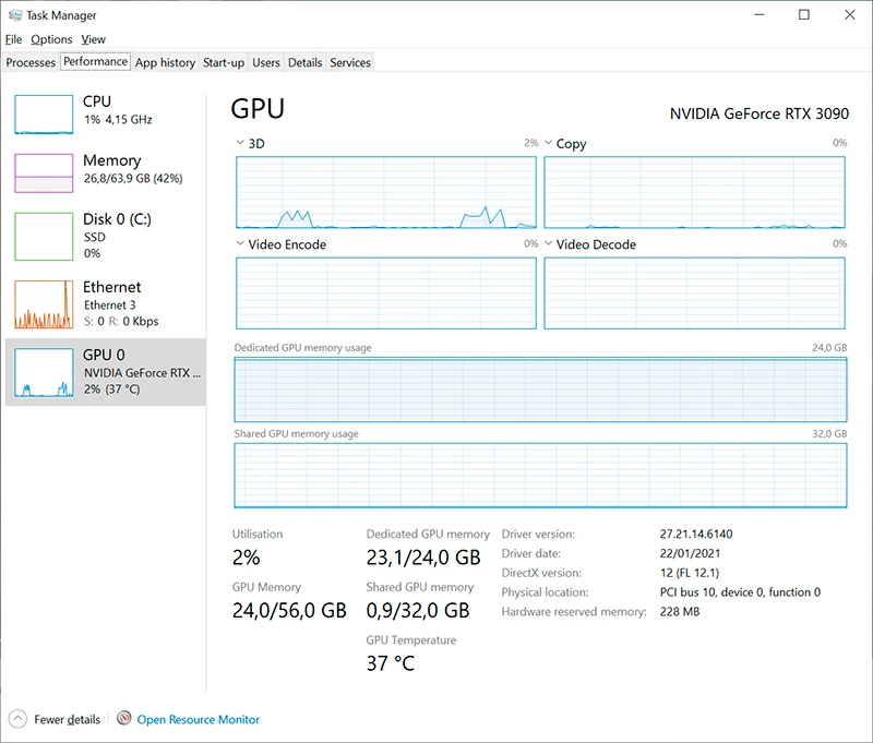 LR uses 22GB of the GPU memory. This amount seems rather unnecessary: LR performed about the same with my previous 8GB graphics card (of which LR used about 7GB, of course, and impacted PS performance the same way):
