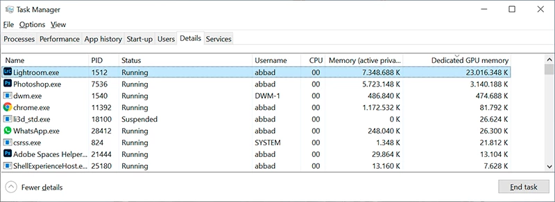 LR and PS constantly up to data via Creative Cloud. Windows 10 up to date, use constantly latest NVIDIA Studio drivers and have no errors or messages in event logs. No other issues. Screenshot of VRAM usage: