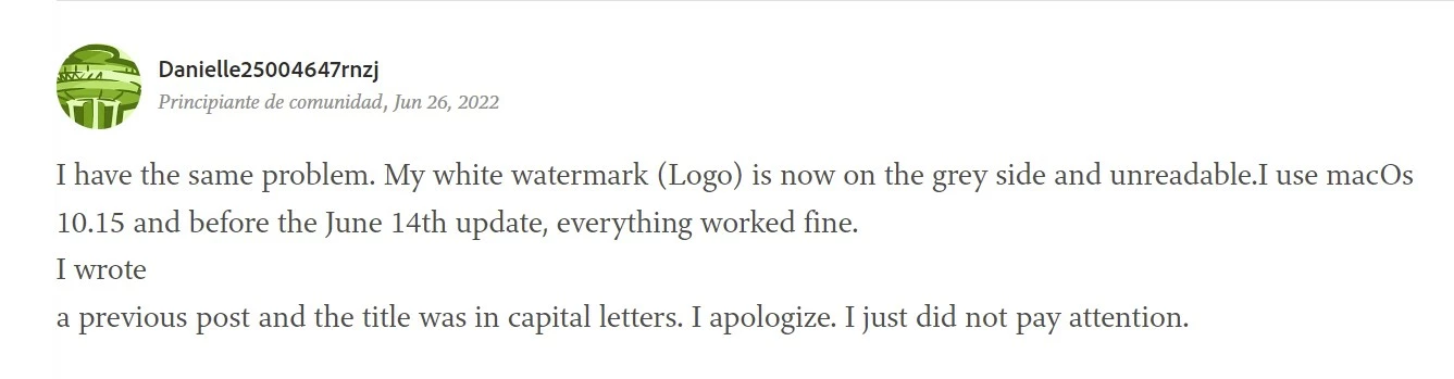 What looks still okay in the watermark editor (as it did in previous versions) gets messed up during export, with light color watermark turning to grey.