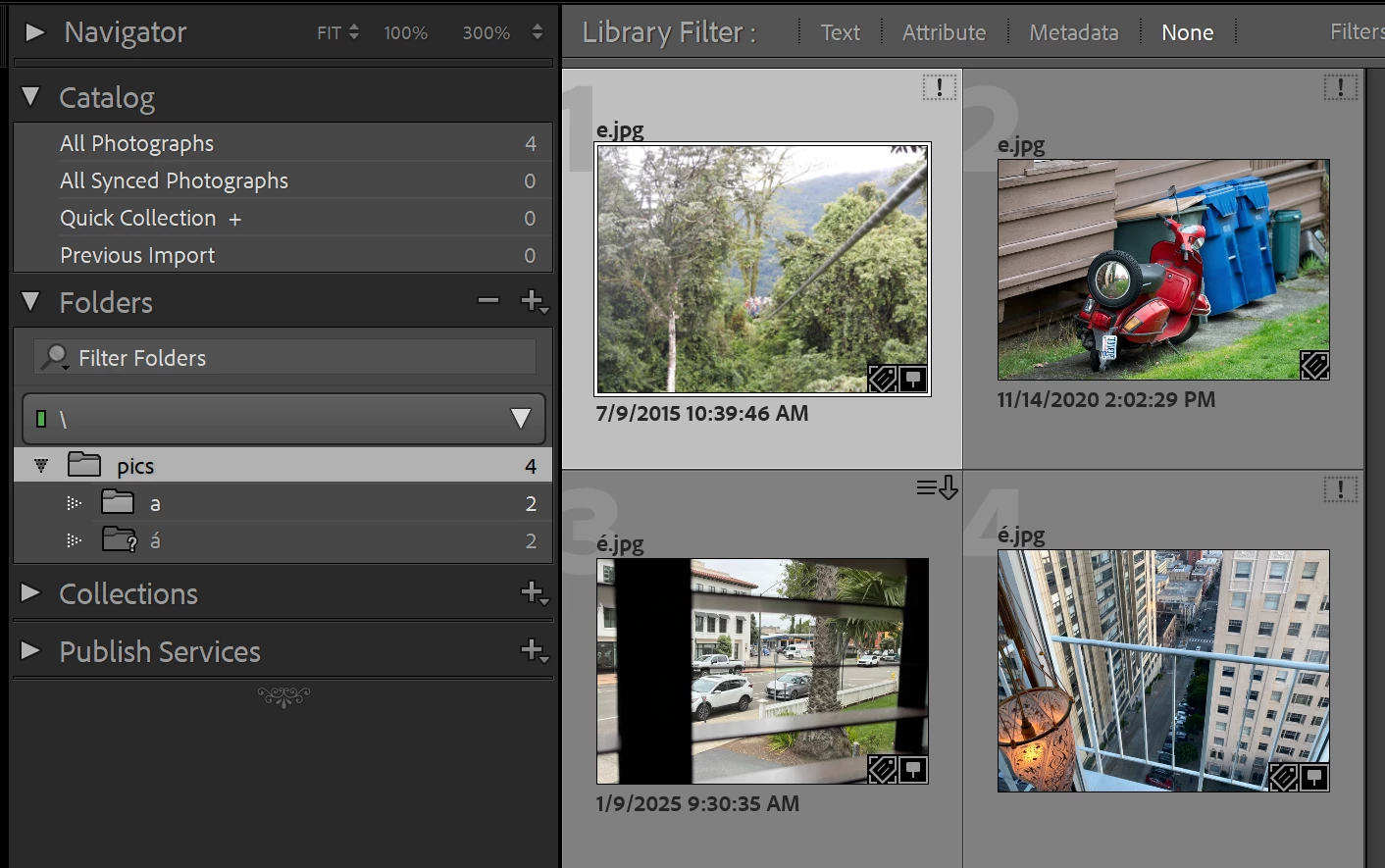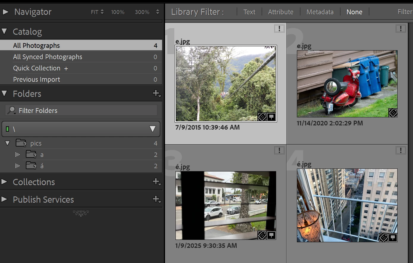 8. Click on All Photographs, and observe that "pics" and "a" are marked as missing again. You may have to adjust the thumbnail size larger or smaller a few times until that happens. The erratic behavior here clearly shows LR is confused.