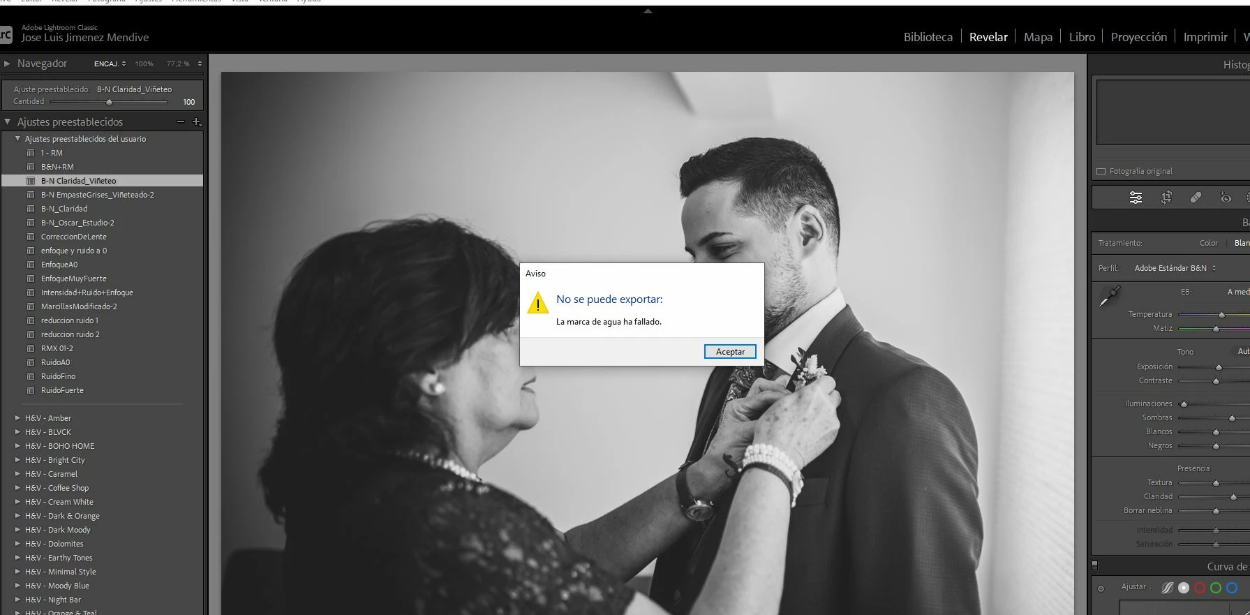 No puedo exportar ninguna foto editada en lightroom classic version 15. Aparece un aviso en pantalla que dice: 'No se puede exportar: la marca de agua ha fallado'. Yo no utilizo ninguna marca de agua ni está activada en la exportación. No se que hacer, no puedo trabajar.