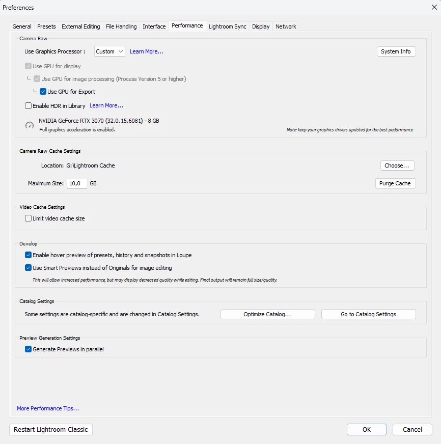 PC is fairly powerful, 14-core i5 (13600k), RTX 3070 with the latest Studio Driver, 64 GB RAM. Performance profile maxed out. Outside of this issue, Lightroom runs fairly well (by Lightroom Classic standards that is...)