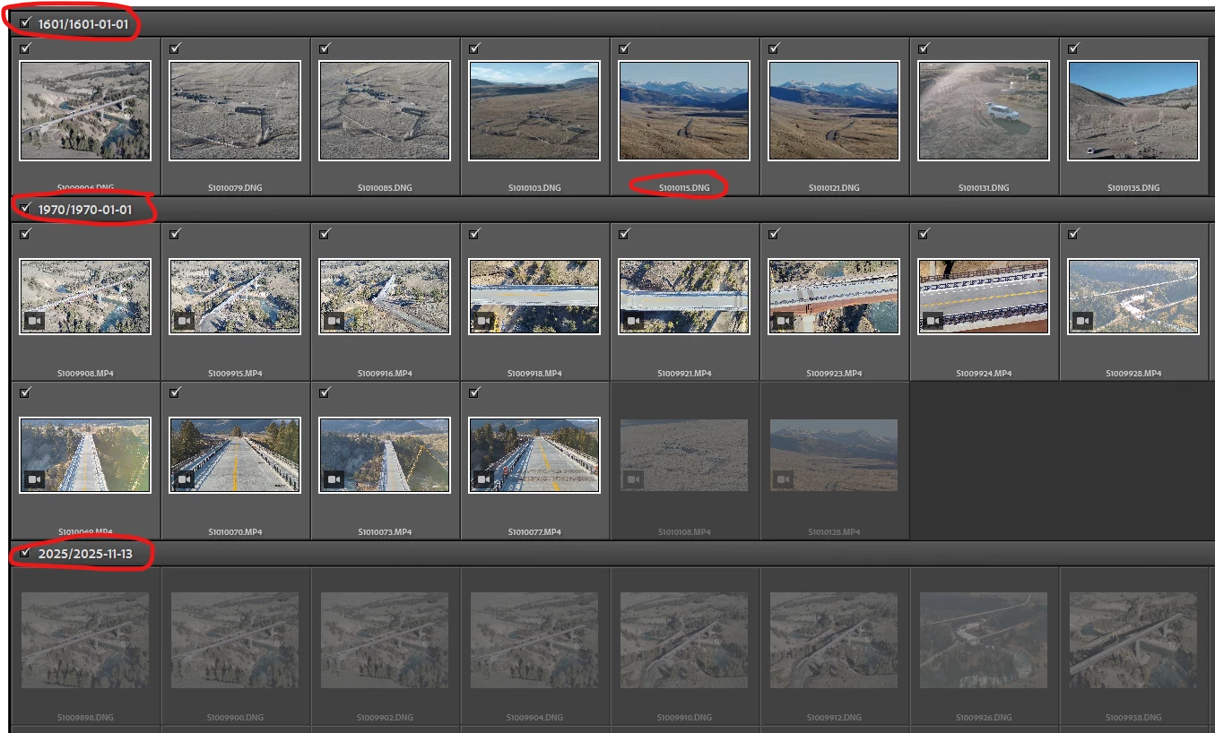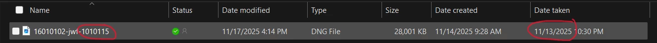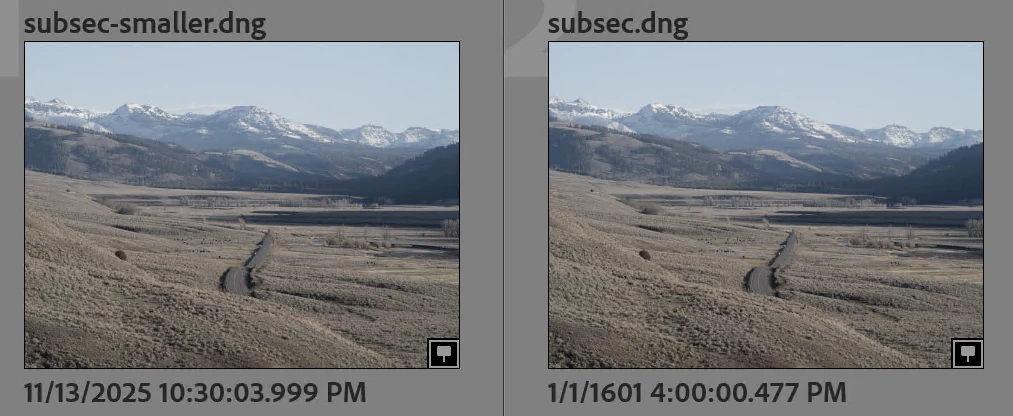 But on Windows 11, observe that the capture time of "subsec.dng" has been mangled to 1/1/1601 4:00:00.477: