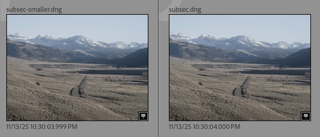 LR 15.0.1 / Windows incorrectly rounds a capture date/time of 11/13/25 10:30:03.99974 PM to 1/1/1601 4:00:00.477 PM. But LR 15.0.1 / Mac correctly rounds it to 11/13/25 10:30:04.000 PM.
