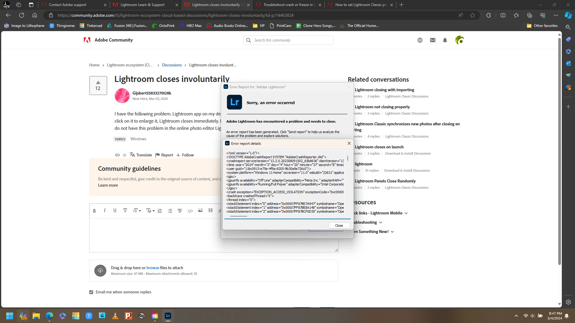 I have the following problem. Lightroom app on my dekstop does start up, but if I select a random photo and then click on it to enlarge it, Lightroom closes immediately. I uninstalled and redownloaded it but the problem remains. I do not have this problem in the online photo editor Lightroom. Does anyone know a solution?