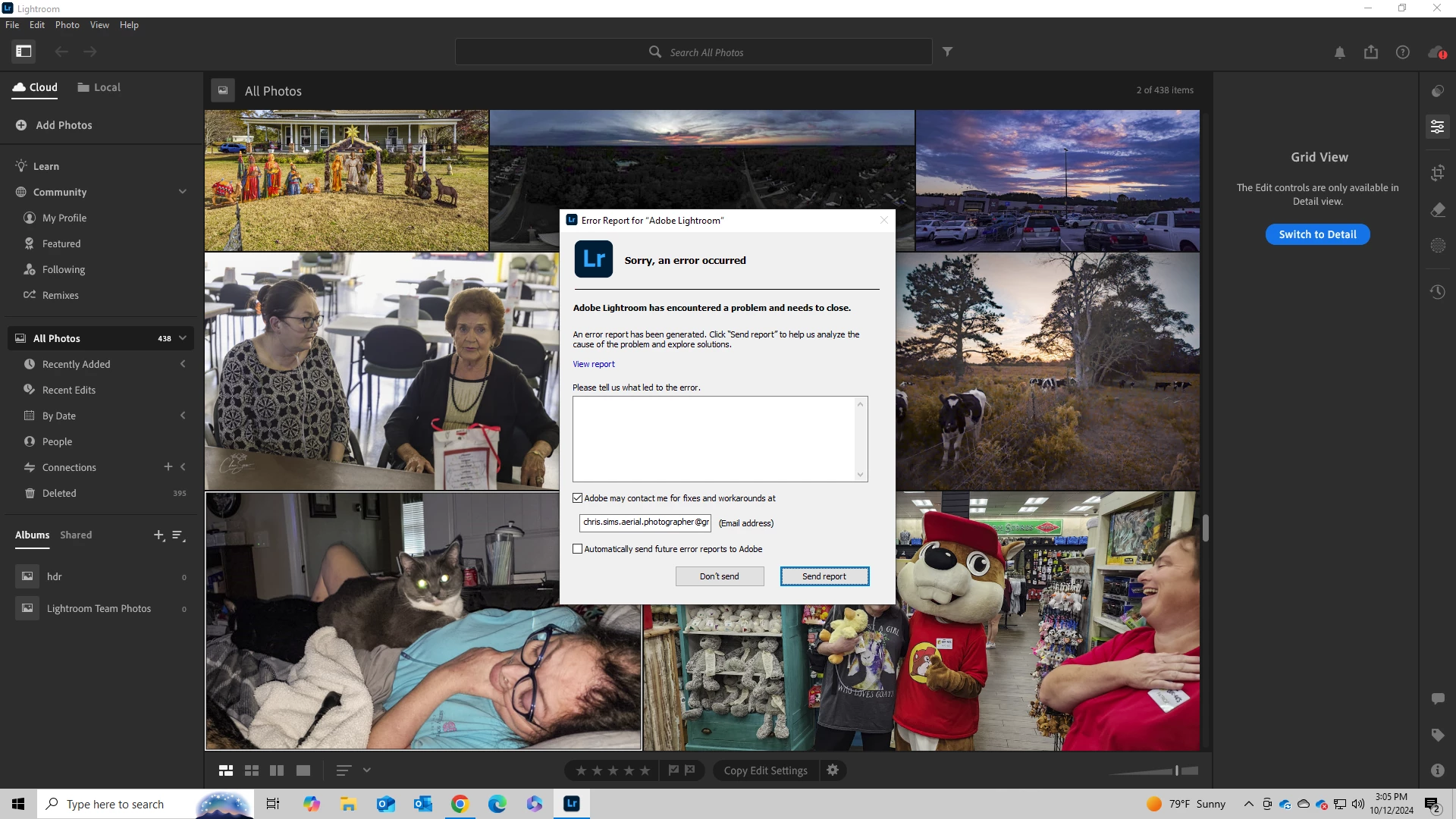 Here we go again. Lightroom began crashing on me over the last few days. All updates are current. Working fine thru the editing process and just began crashing. I have filed many reports and no contact from Lightroom yet. Anyone else have this issue just begin? Hoping for a work around.