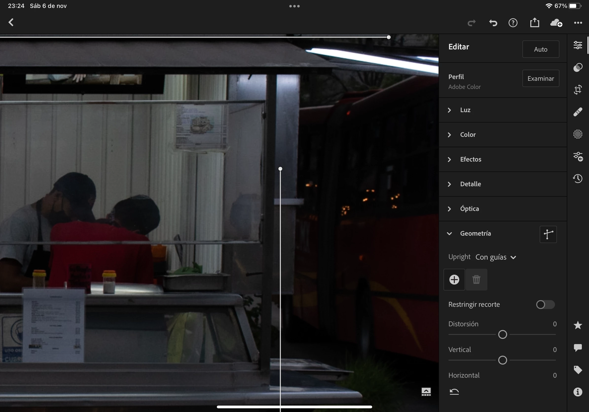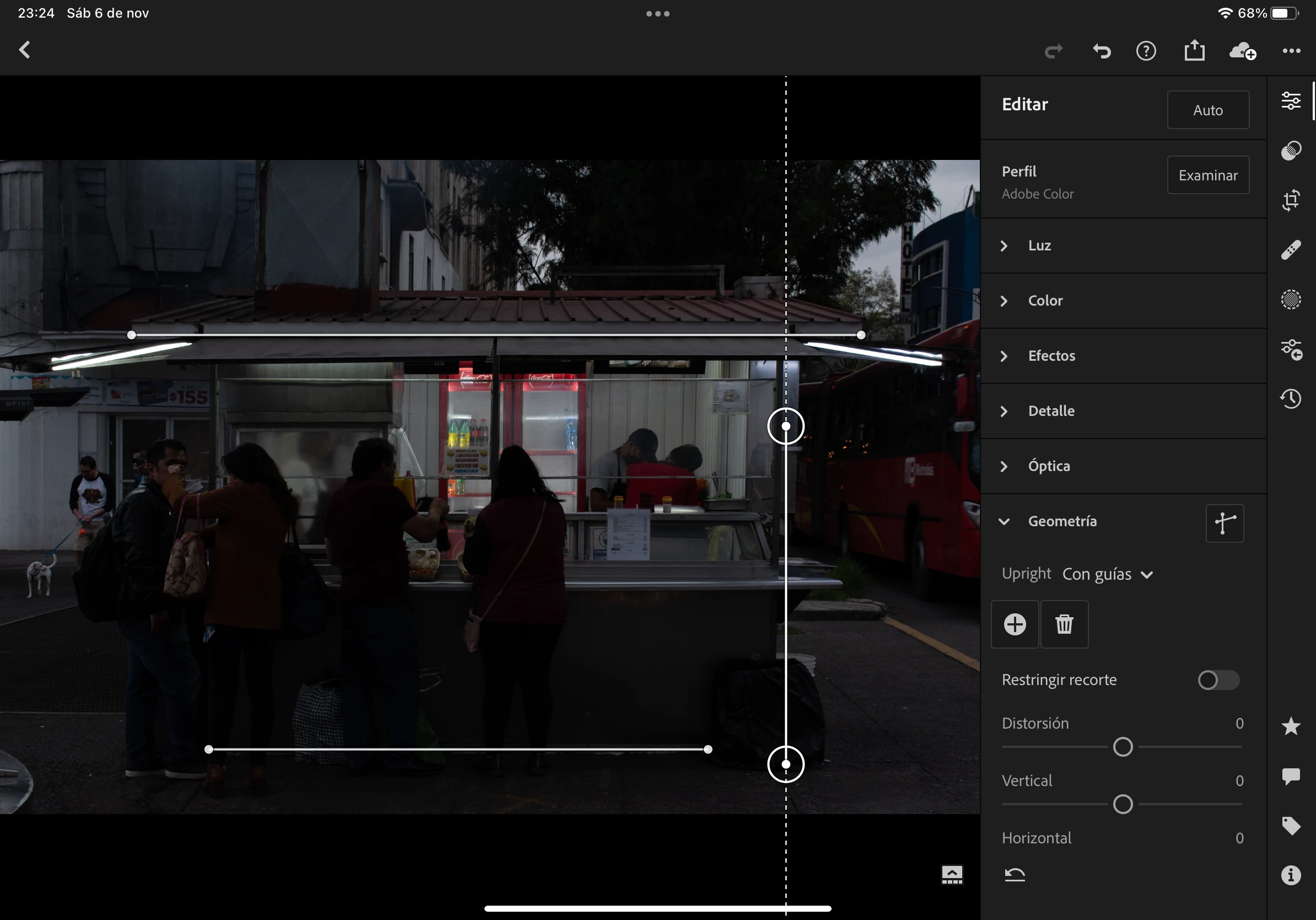 En lightroom para iPadOS, al colocar las guías de corrección de geometría y luego hacer zoom en la imagen, estas guías se mueven por lo que tienes que quitar las guías y volver a colocarlas.