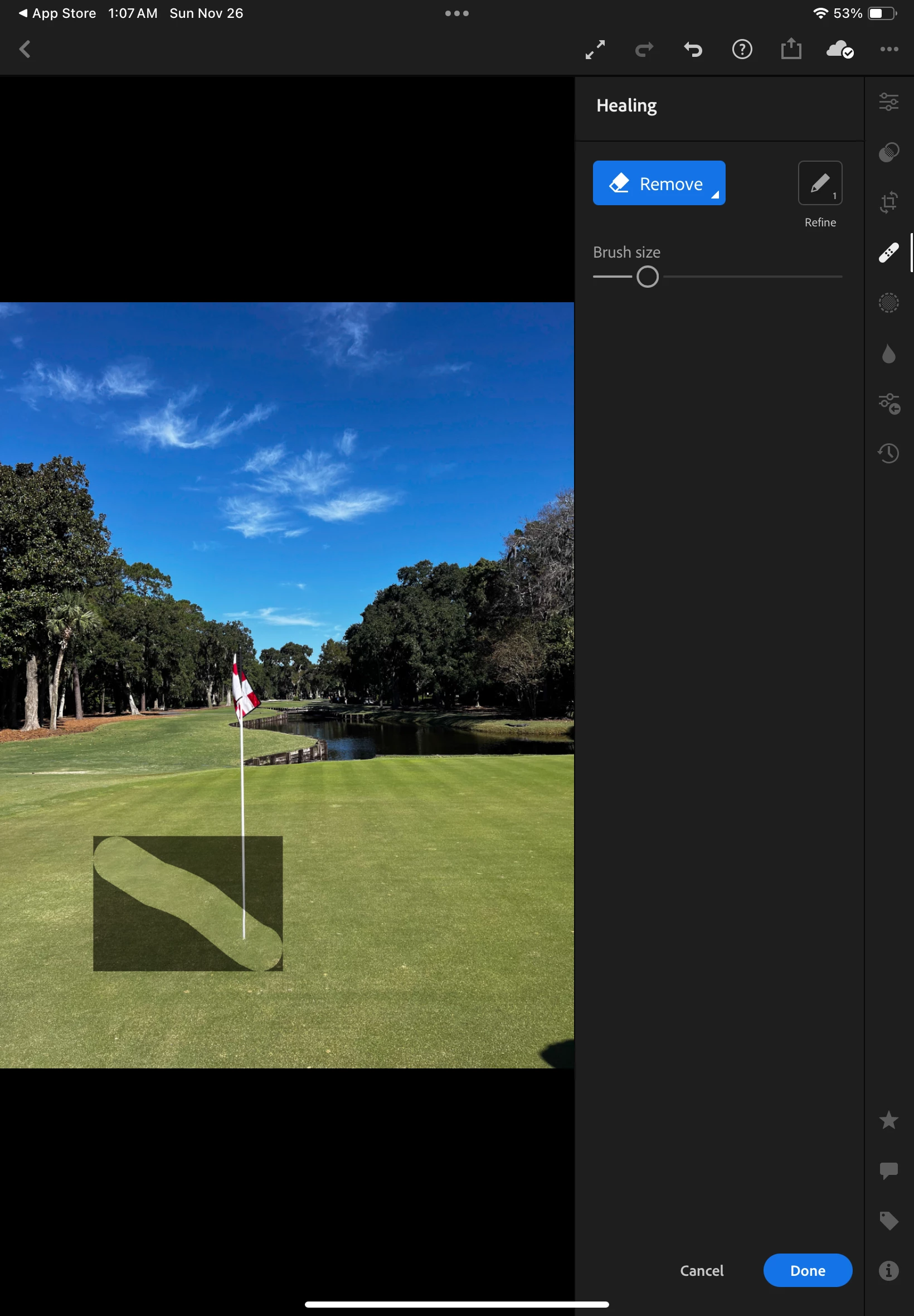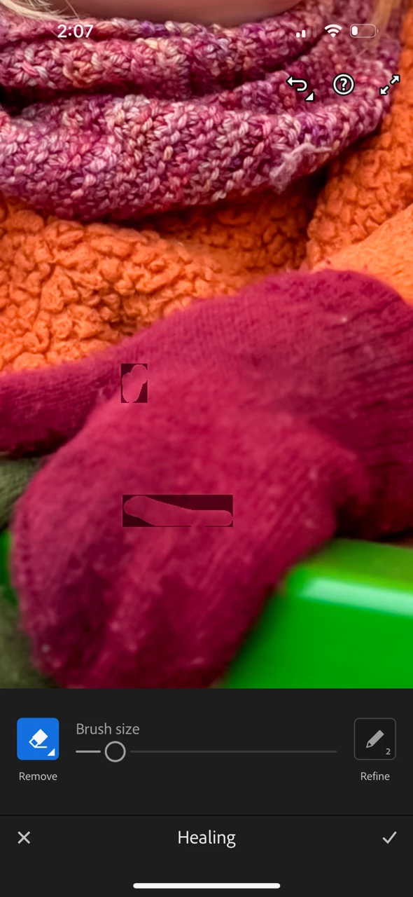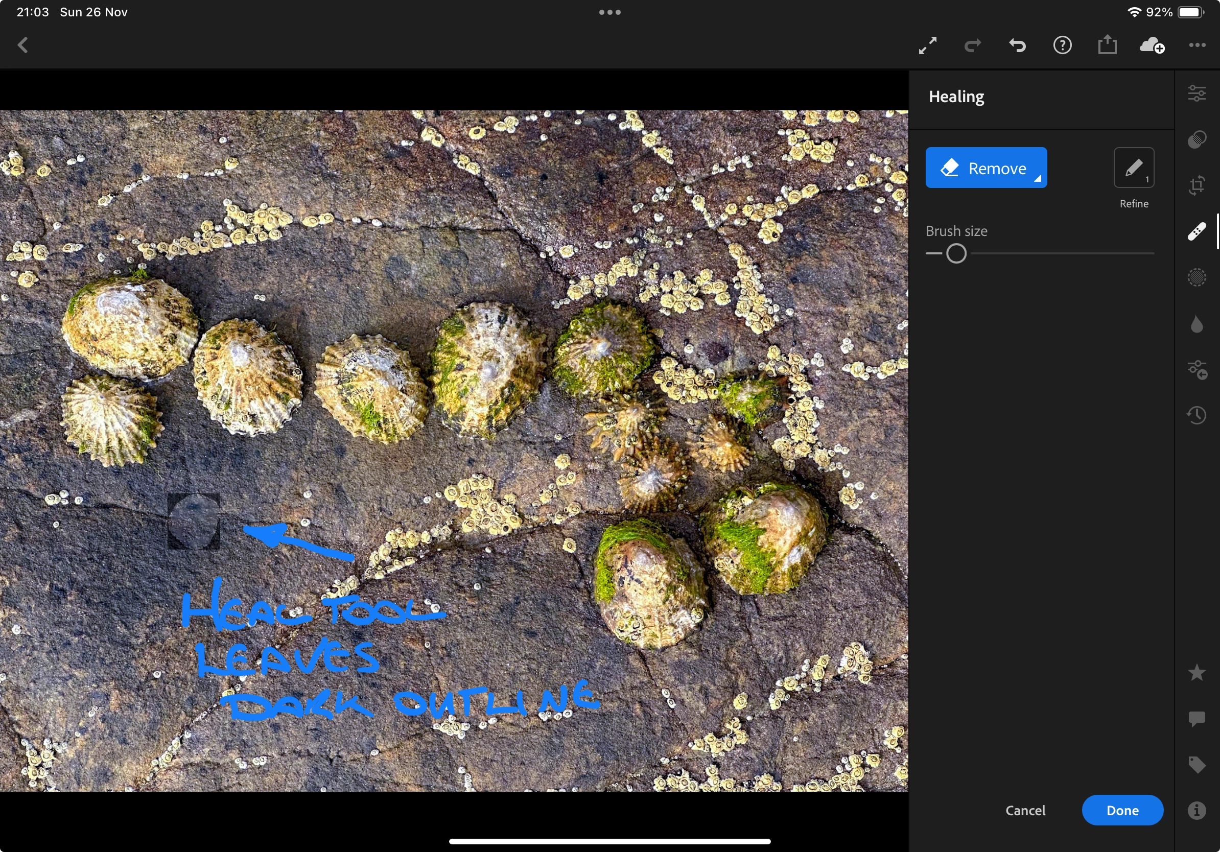 Having an issue with the heal brush. I'm finding whenever I use it it leaves a dark outline over the item I want to remove. Tried Remove and Heal they are both the same. Example below Using M1 IPAD Pro and iPhone 14 Pro, both have same issue.