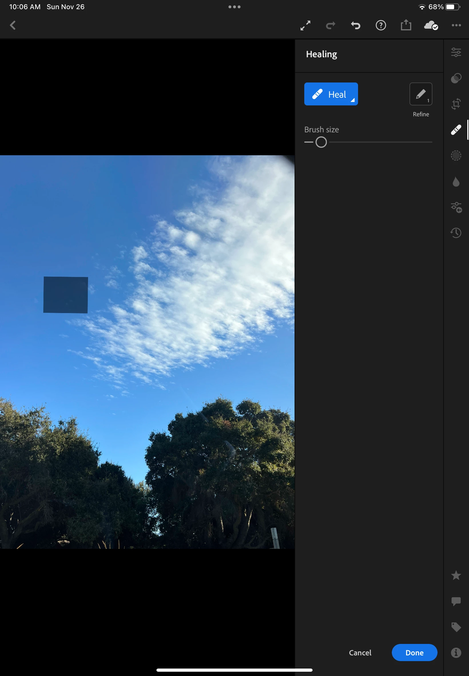 When using Lightroom on iPad I get a gray square evertime I use the heal tool. It's not happening on my phone, only on iPad. Please help; this tool used to work just fine.