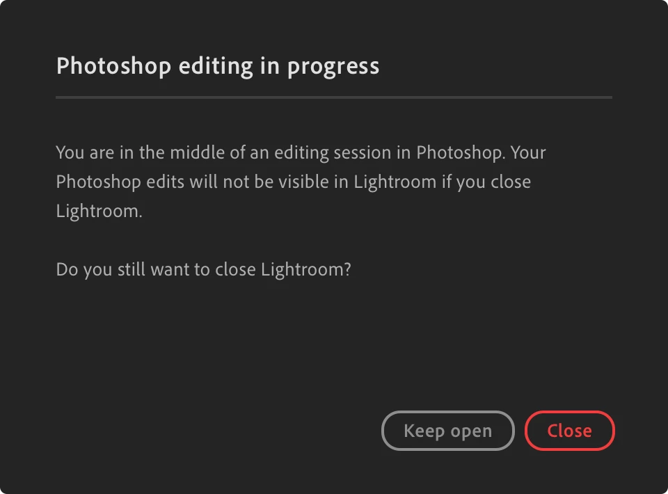 Hi, Im new to using Adobe software on Mac OS. I've been using it perfectly fine on Windows and iPad OS for the last couple of years. Since i've bought my new MacBook Pro 14" with M1 Pro running the latest version of Monterey OS i've ran into an issue with my usual workflow. I would usually start off in Lightroom as i find it easier to do quick initial edits and also organise albums easier. Then i select the "Edit In Photoshop" button which opens up fine and i can continue editing. Then usually im used to simply closing the file so it auto saves and it will import straight back into Lightroom and stack with the original file. For some reason though this isnt happening it prompts me to instead save it as a separate file inside Photoshop.