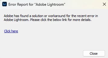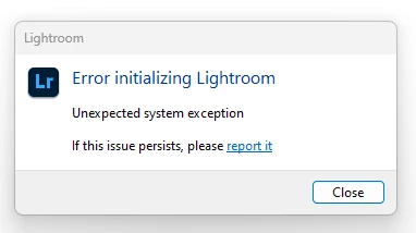 For the past few weeks or so, normal Lightroom (Win 11- v6.4) won't open anything. Whether I open from Adobe CC, the Lightroom shortcut, or right-clicking a photo to 'open with' LR - I get this error message immediately, every time. I've uninstalled LR, the creative cloud app, and tried everything I've read and can think of. I decided to wait and see if anyone else on here has had a similar issue, but no luck. It's getting real frustrating paying for almost a full month now while not being able to use one of my biggest Adobe assets.  LRC also seems to work totally fine. Any help is majorly appreciated, I've just shot a wedding over the weekend.