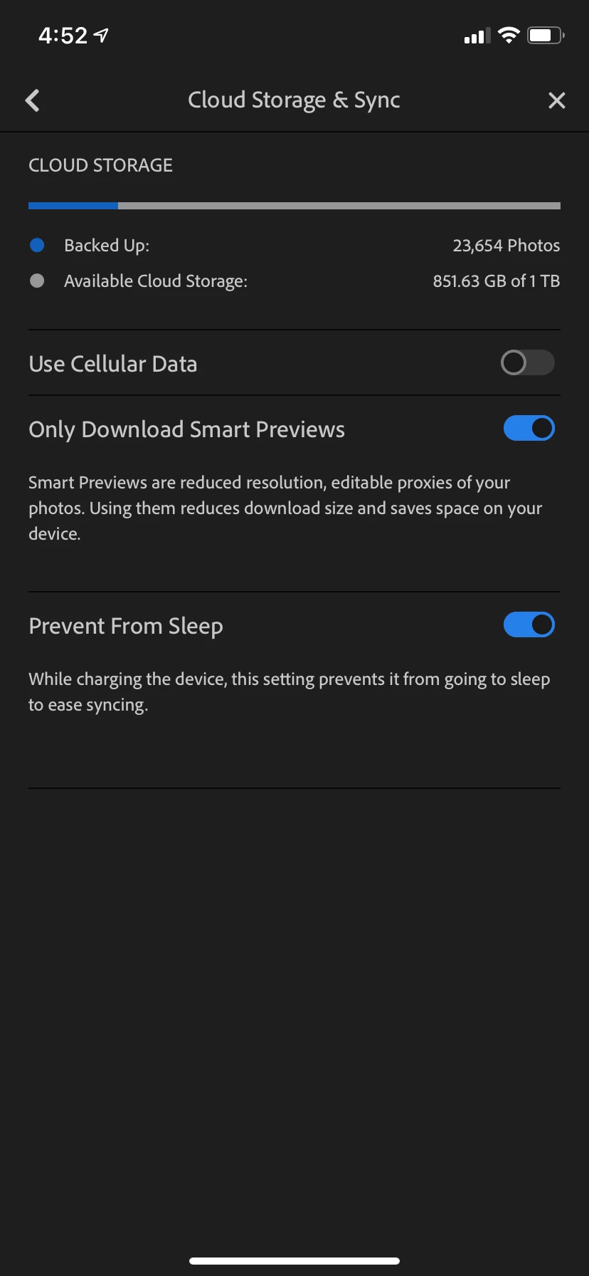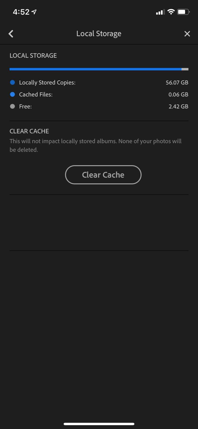 You can see my settings for Lightroom in the screenshots. You can also see how much local storage is being used by Lightroom - it is using 56.07gb of local storage. As a result, I am constantly getting the "Your iPhone storage is full" message, which makes my phone unusable for doing things like....taking photos. The irony!