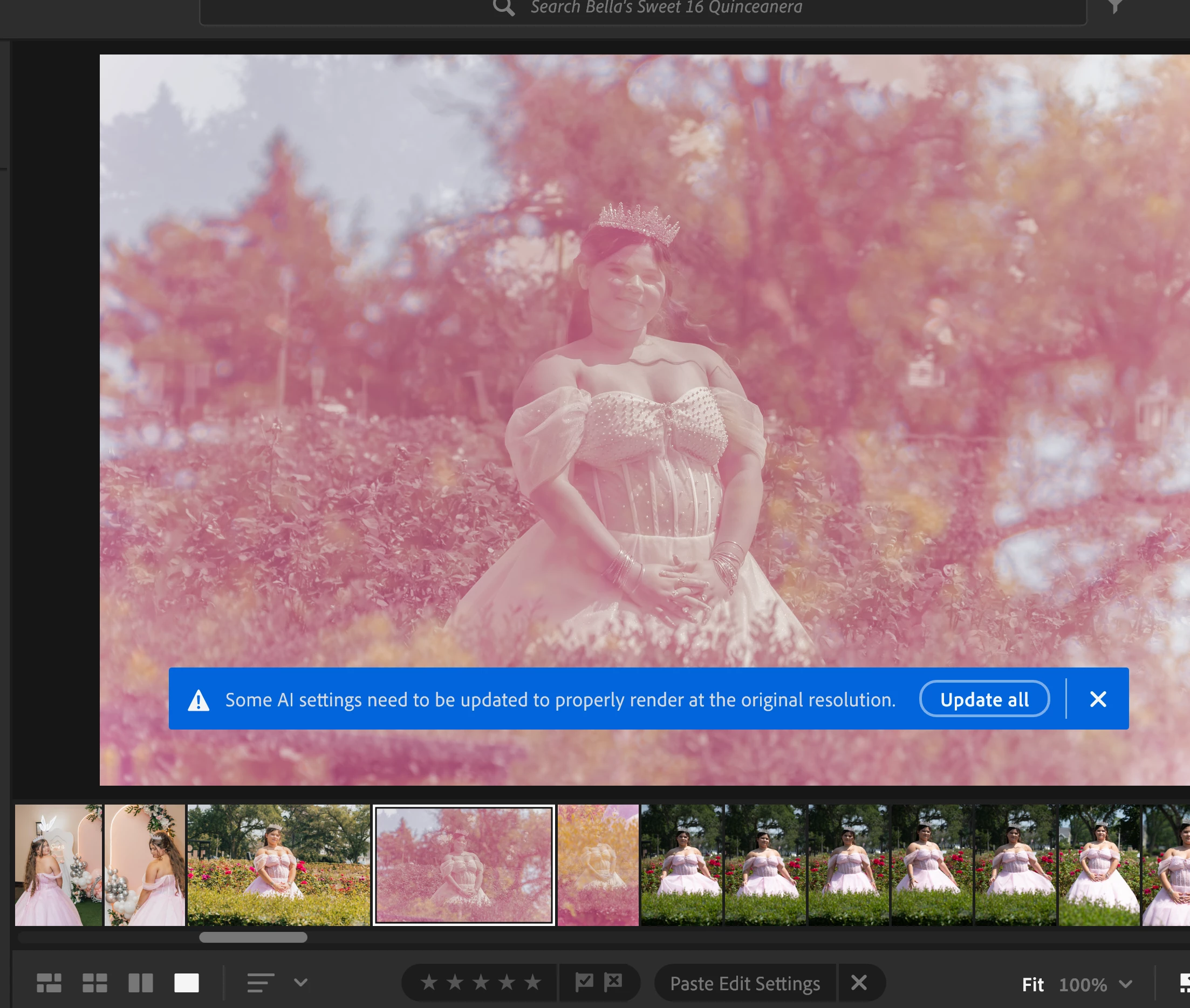 Bug 2) I also tried pasting onto multiple images at once and it turned a bunch of them weird colors until I let them update AI settings. I think it might have something to do with the denoise features, TBH.