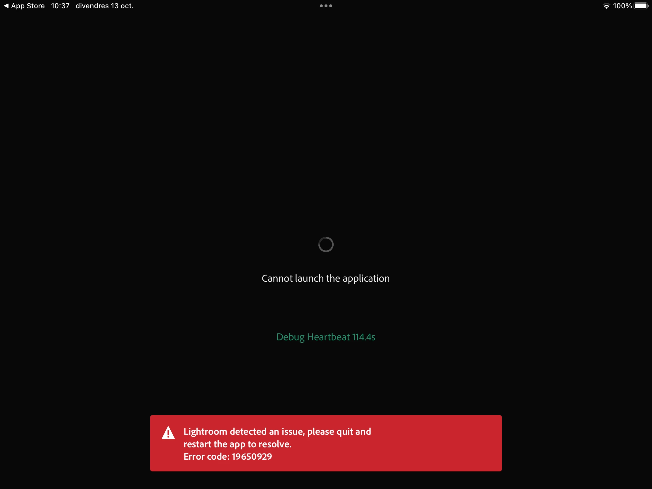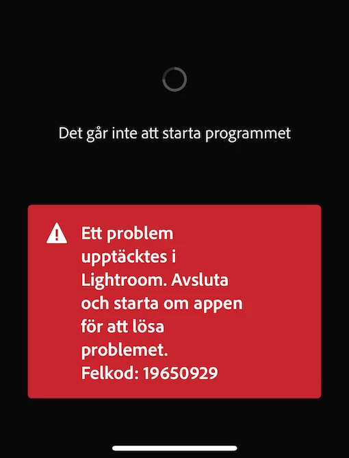"Lightroom detected an issue, please quit and restart the app to resolve. Error code: 19650929"