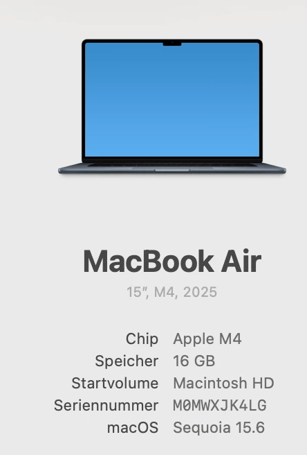 Informationen zum Grafikprozessor: Metal: Apple M4 Grafikprozessordaten: geladen: Ja, unterstützt: Ja, Computing: Ja, Init.: I4_GPU4, Hardware: success, Software: success, al: Ja, dl: Nein Medienfähigkeit des Betriebssystems: true