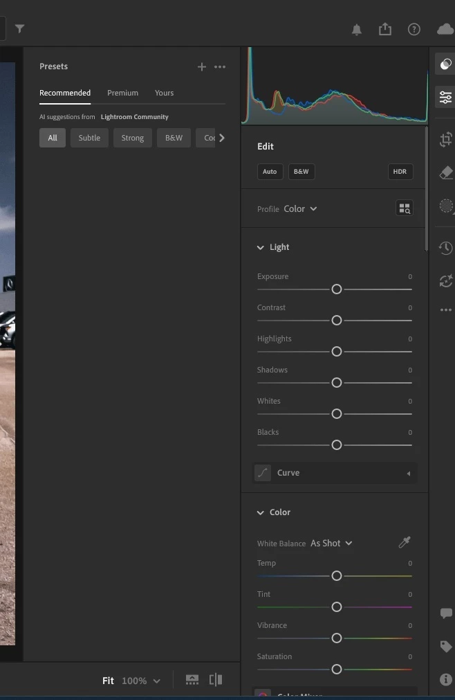 En la versión web de Lightroom, los ajustes recomendados aparecen correctamente (con miniaturas y sugerencias de IA). Sin embargo, en la aplicación de escritorio (Windows), el panel carga pero queda completamente vacío, sin mostrar ningún preset.