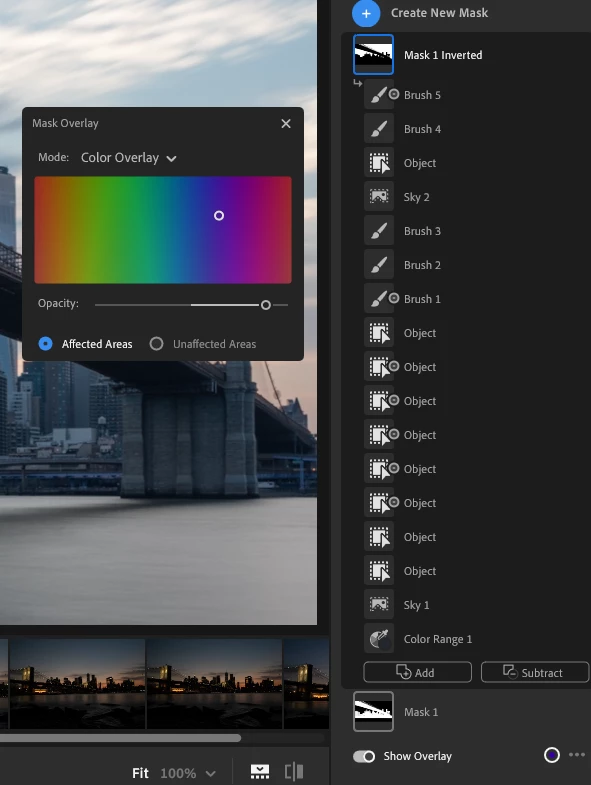 • When the overlay is invisible for these specific AI masks, the mask itself is generated (adjustments affect the correct area), but the visual feedback (overlay) is missing.