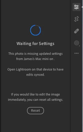 Now, I much more worrysome problem occurs (very frequently) : when I try to edit a photo on my main Mac, LR CC tells me that editing parameters are missing and that I should open the app on the mac where the edits where made... which is precisely that Mac, which makes the alert totally meaningless. Therefore, as far as I can tell, all my edits are lost (and I have an exhibition next week). Please help, this is very very bad.