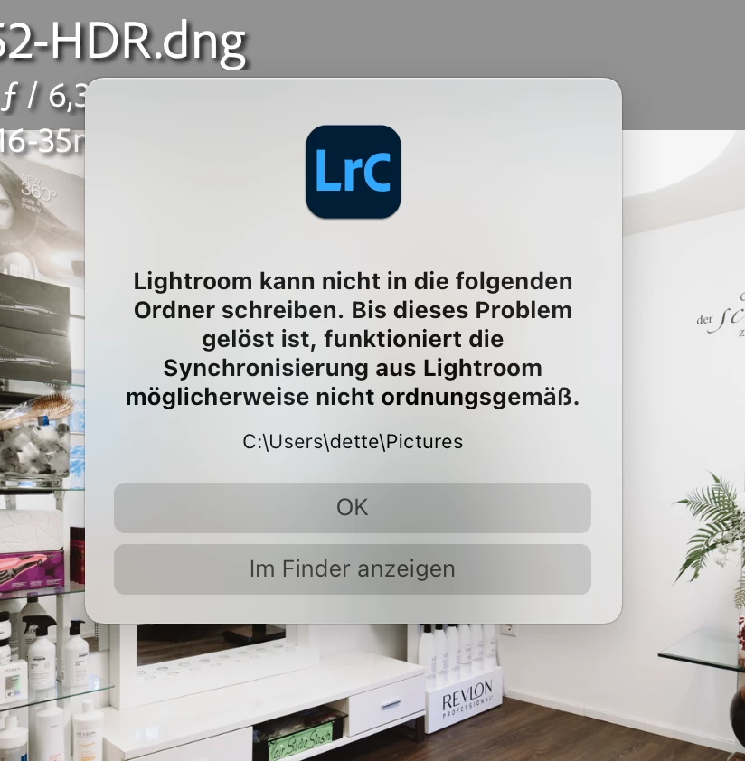 Below you can see the path where all Lightroom photos have been saved for years and will continue to be saved. So there is currently no problem except that this error message appears every time you open it.