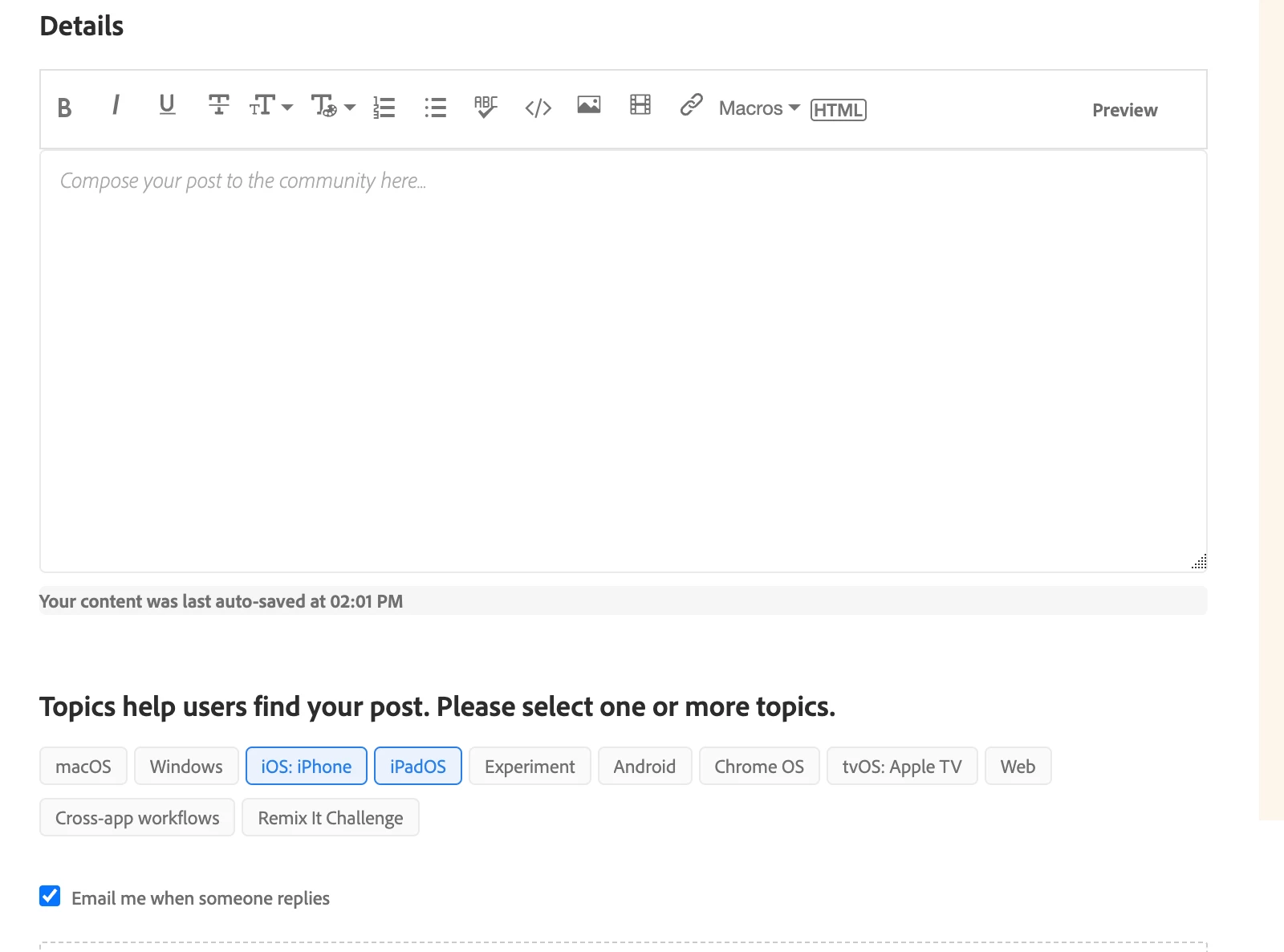 Search to see if a recent existing thread for that combo exists and add to it. If you can't find a similar recent thread, then post a new thread and include information about your devices, OS's, workflow etc.
